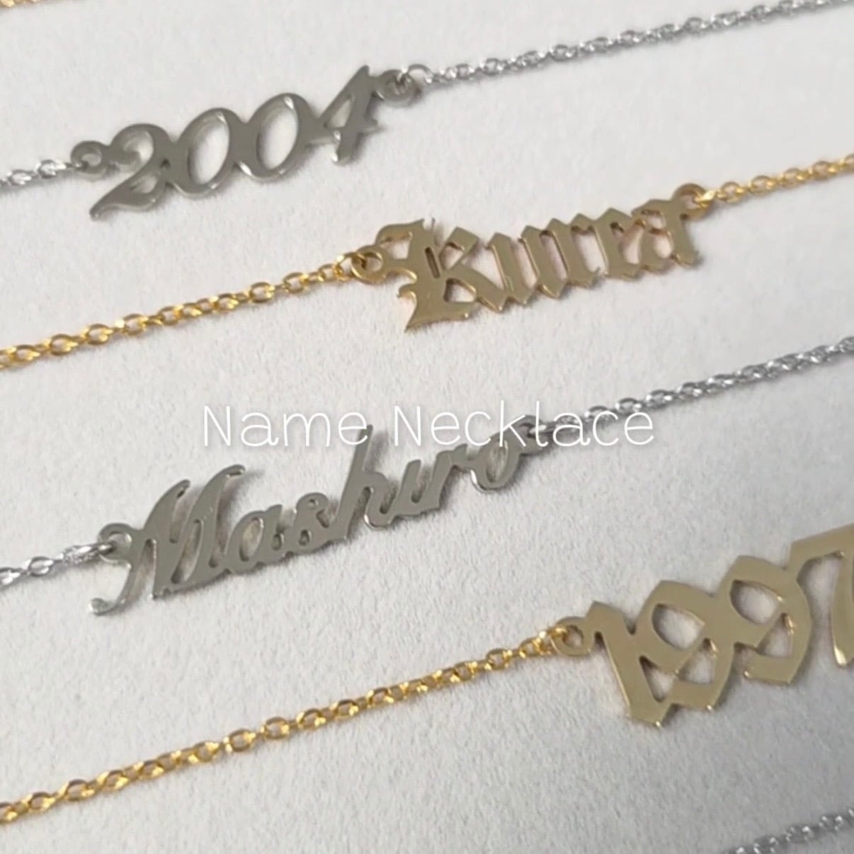 商品名:ネームネックレス 【商品説明】 世界にひとつだけの“名前ネックレス” 大切な人とペアで身につける、特別なネックレス。 ☑金属アレルギー対応 ☑色落ち、変色の心配もございません。 ☑ずっと着けたままでok!! 刻印するフォントは全4種類!! イメージ写真参照。 【サイズ】 ネームプレート:20~40mm程度(アルファベット、文字数によって異なる) チェーン長さ:38cm~45cm(アジャスター調整可)男女兼用 ※プレートの長さもチェーン長さに含む ※サイズ感については、指定があればご要望に合わせます。 製作前に、お問い合わせくださいませ。 【素材】 サージカルステンレス316L 真鍮(トップ部分) 【特徴】 ・名前・日付の刻印OK ・最短翌日発送対応 ・専用ギフトボックス付き(+500円) 【ご注文の流れ】 ① 商品購入 ② デザイン確認(公式LINE対応) ③ 製作 → 発送(通常1~5営業日) 【よくある質問】 Q:ラッピングできますか? A:+500円でギフトボックスをご用意しています。 Q:注文後の刻印変更は可能ですか? A:製作開始前までなら可能です。LINEでご連絡ください。 ────────────── 【無料サンプルLINEから】 ▶ https://lin.ee/bRD6Jpb ──────────────